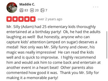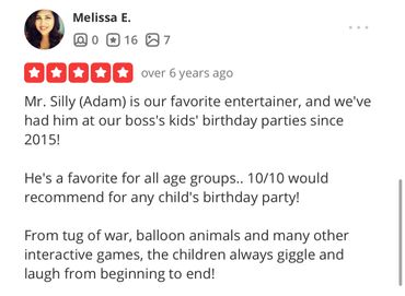 Hi everyone! I"m Adam Smith.I have combined all of my training in Improvisation, Acting and Musical Theater to create the one and only character Mr. Silly. Multi talented person that I am,I also known for my DJ skills, Magic, My designing and building of Haunted Houses, back drops and props. My latest adventure is working on photo shoots, TV commercials and movie shoots wrangling and entertaining the child actors and models.